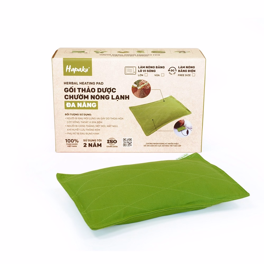 Gối chườm thảo dược Hapaku là sản phẩm kết hợp các loại thảo dược tự nhiên, giúp nhanh chóng xoa dịu cơn đau mỏi vai gáy, lưng, hông do thoái hoá, thoát vị, đau dây thần kinh tọa, do ngồi làm việc lâu một tư thế, giúp làm việc, sinh hoạt tiện lợi, dễ dàng hơn, làm ấm cơ thể, giảm cơn đau bụng kinh.