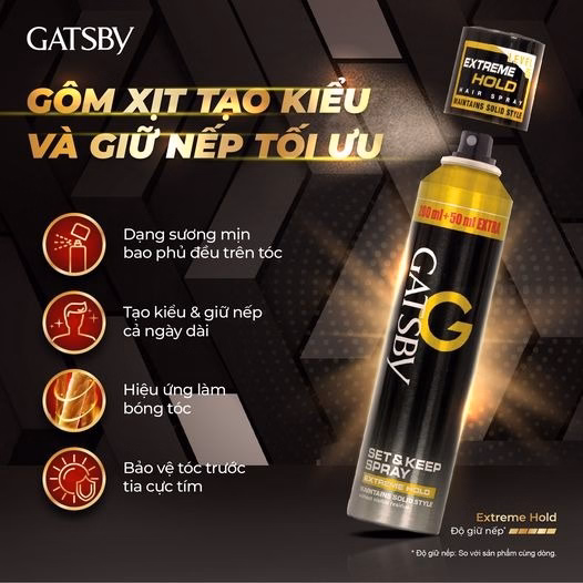 – Đây là 1 sản phẩm khá thú vị của Gatsby khi mang những đặc tính lai của Pomade và Gôm xịt tóc đó là Độ bóng cao ( Pomade) và dạng xịt tiện dụng ( Gôm ). Cho nên nếu như anh em cần 1 sản phẩm tạo kiểu nhanh gọn lẹ, không phải dính tay, độ giữ nếp vừa phải và độ bóng trên tóc tối ưu thì đây là sản phẩm dành cho anh em.