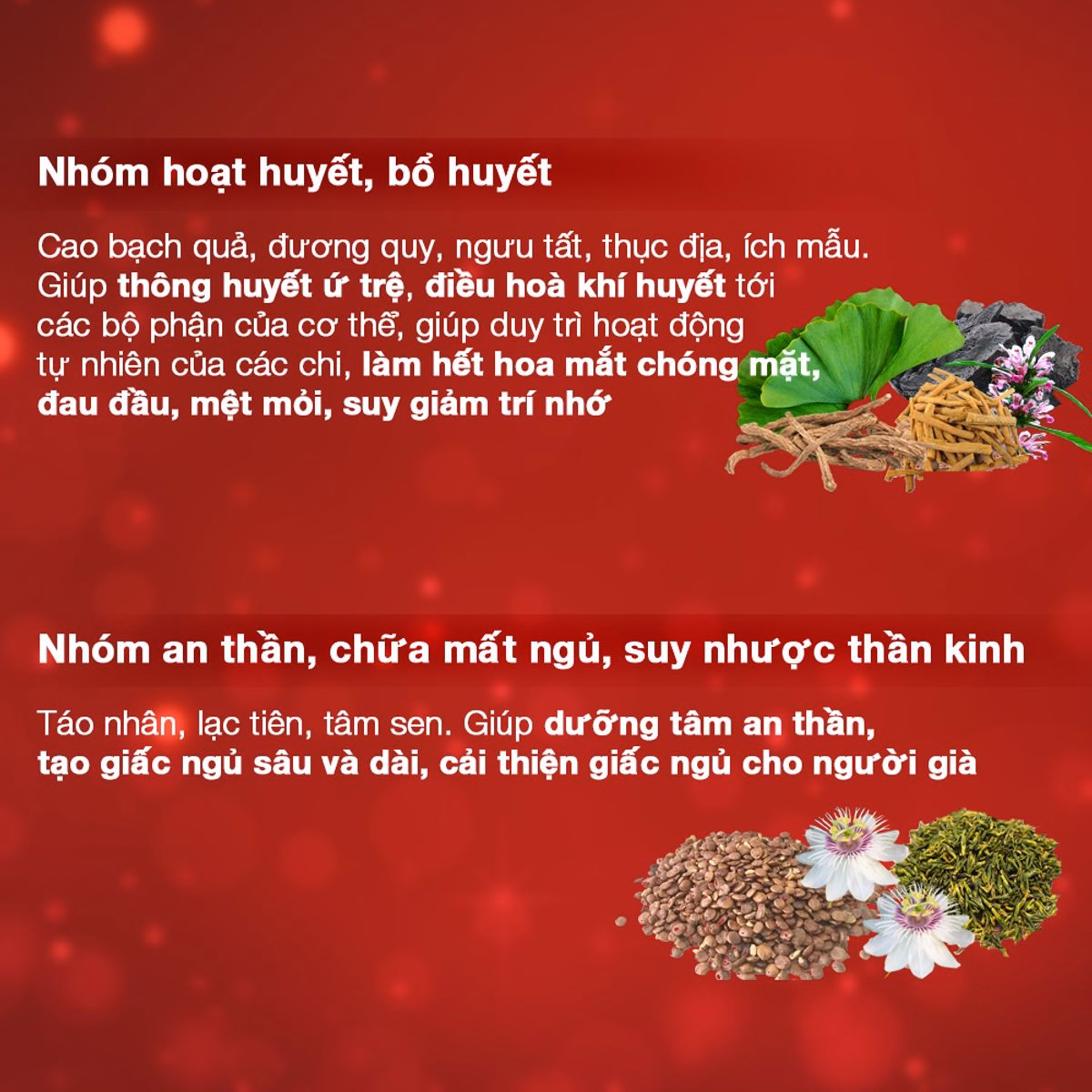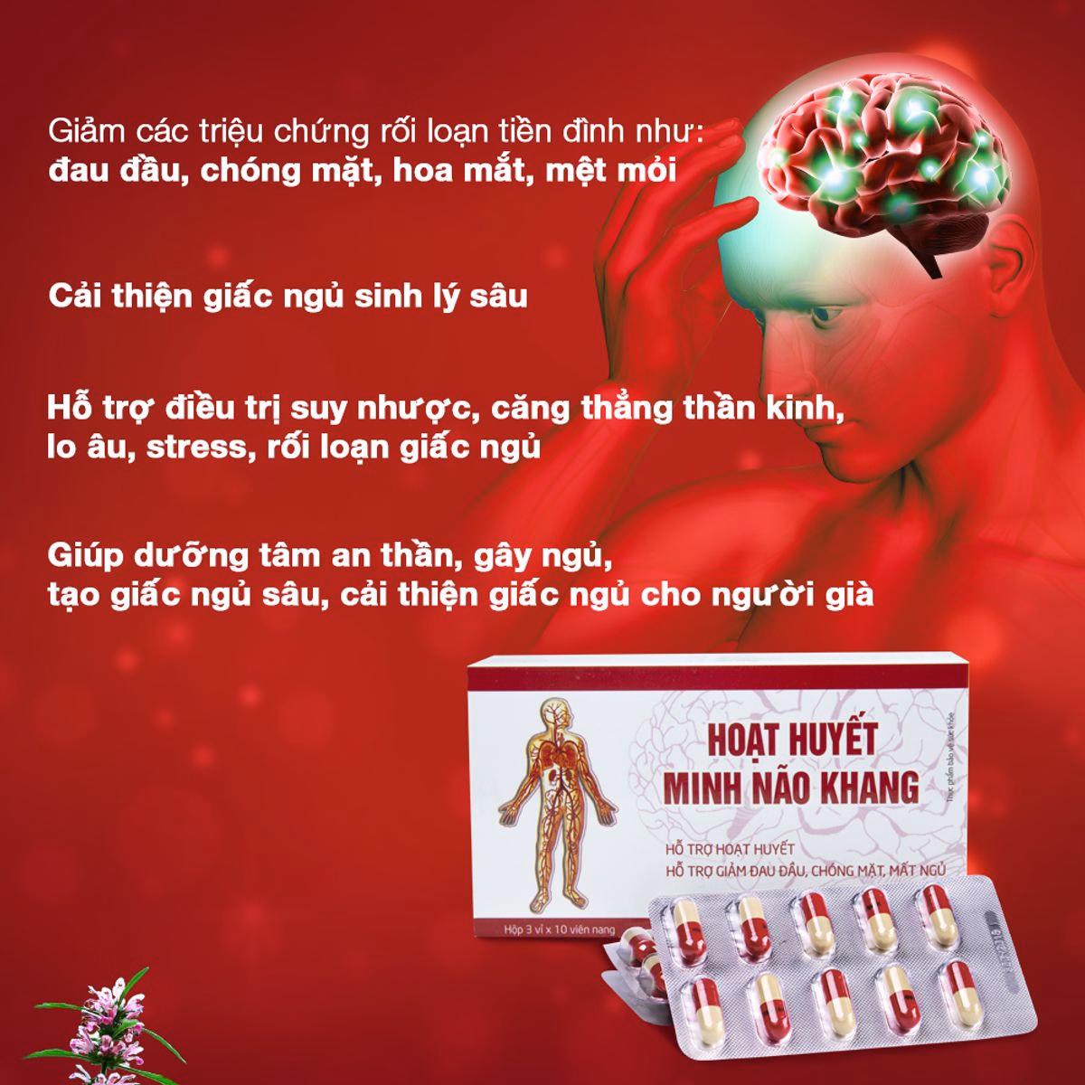 Hoạt huyết minh não khang – Dân Khang được bào chế từ các dược liệu thuộc nhóm bổ huyết có tác dụng tuần hoàn máu tới các bộ phận của cơ thể, giúp an thần, tạo giấc ngủ sinh lý sâu.