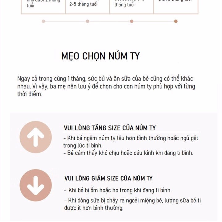 ▪️Tăng size khi: (1) Trẻ ngậm núm ty lâu hơn thường ngày, hoặc ngủ gật trong lúc ti bình. (2) Trẻ cảm thấy khó chịu hoặc cáu kỉnh khi đang ti bình