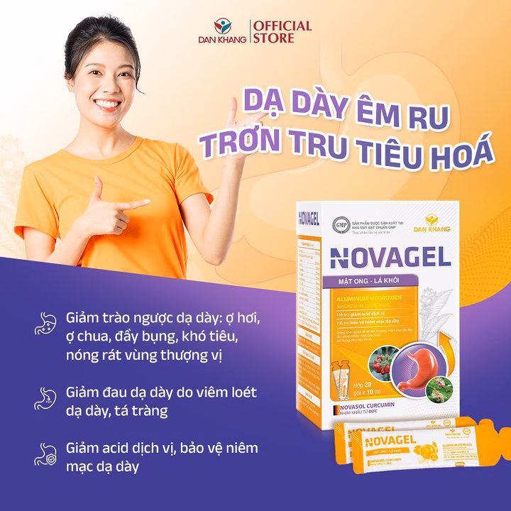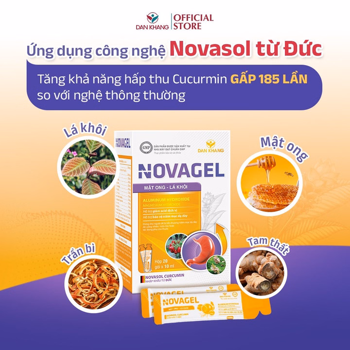 Sản phẩm Novagel sử dụng công nghệ Novasol Curcumin nhập khẩu từ Đức giúp hỗ trợ giảm acid dịch vị – Hỗ trợ giảm đau dạ dày và bảo vệ niêm mạc dạ dày.