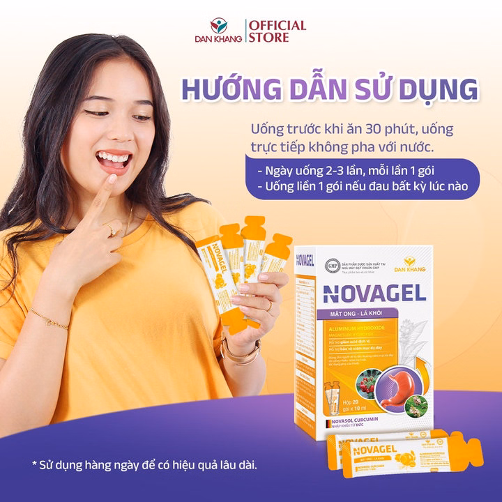Liều dùng: Ngày uống 2-3 lần, mỗi lần 1 gói 10ml. Uống trước bữa ăn 30 phút hoặc uống khi đau. Không nên sử dụng cùng thuốc khác trong vòng 2-4 tiếng khi uống Novagel