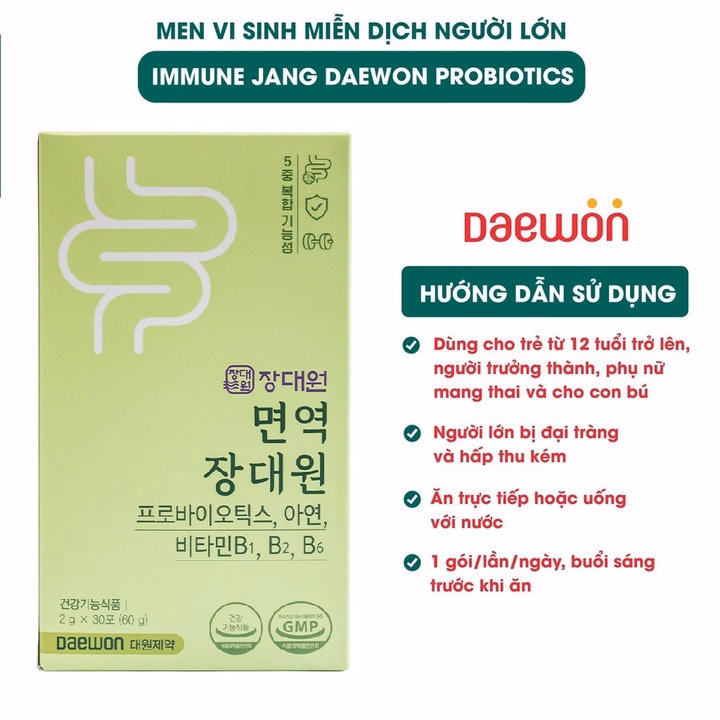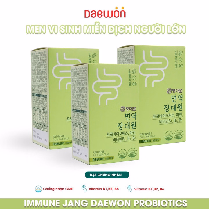 Men vi sinh Immune Jang Daewon Probiotics là sản phẩm men vi sinh nội địa bán chạy nhất tại Hàn Quốc. Mỗi gói men vi sinh bổ sung > 21 tỷ lợi khuẩn, Vitamin B1, B2, B6 và Kẽm cho người lớn