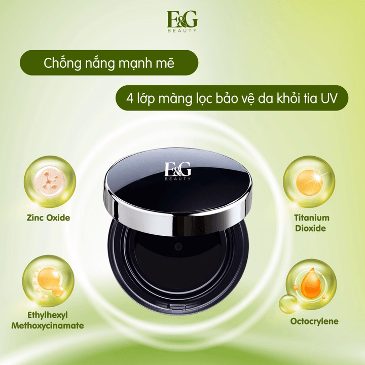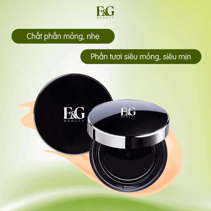Phấn nước Cushion E&G Beauty ứng dụng công nghệ phấn tươi với hàng triệu phân tử phấn siêu nhỏ, giúp tạo lớp nền mỏng nhẹ, hỗ trợ thẩm thấu nhanh.