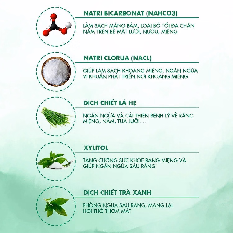 Nacl, Nahco3, Xylitol, Dịch chiết trà xanh, Dịch chiết lá hẹ