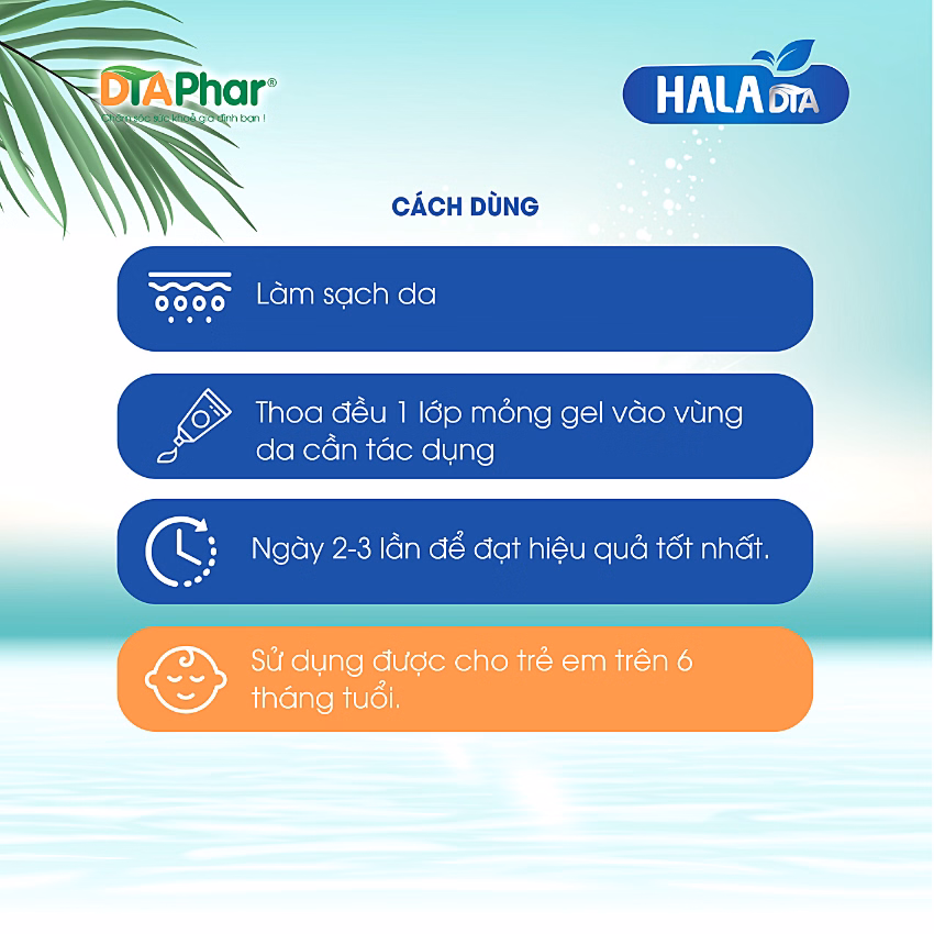 Làm sạch da, bôi 1 lớp mỏng gel vào vùng da cần tác dụng, ngày 2-3 lần để cho hiệu quả tốt nhất.