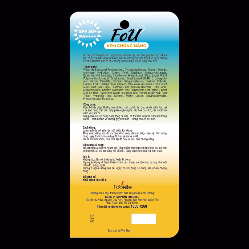 Kem Chống Nắng Fo’U Spf50+ Pa++++ Nâng Tone, Không Gây Bết Dính Có Thể Dùng Toàn Thân 50G – Fobelife