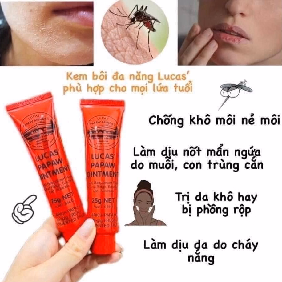 – Kem đa năng Lucas Papaw Oinment được chiết hoàn toàn từ thiên nhiên ( chiết xuất từ đu đủ) có công dụng giúp trị các vấn đề về da như: khô da, khô môi do thời tiết, phỏng da, hăm tả ở trẻ em, bị phát ban, mẩn ngứa,…