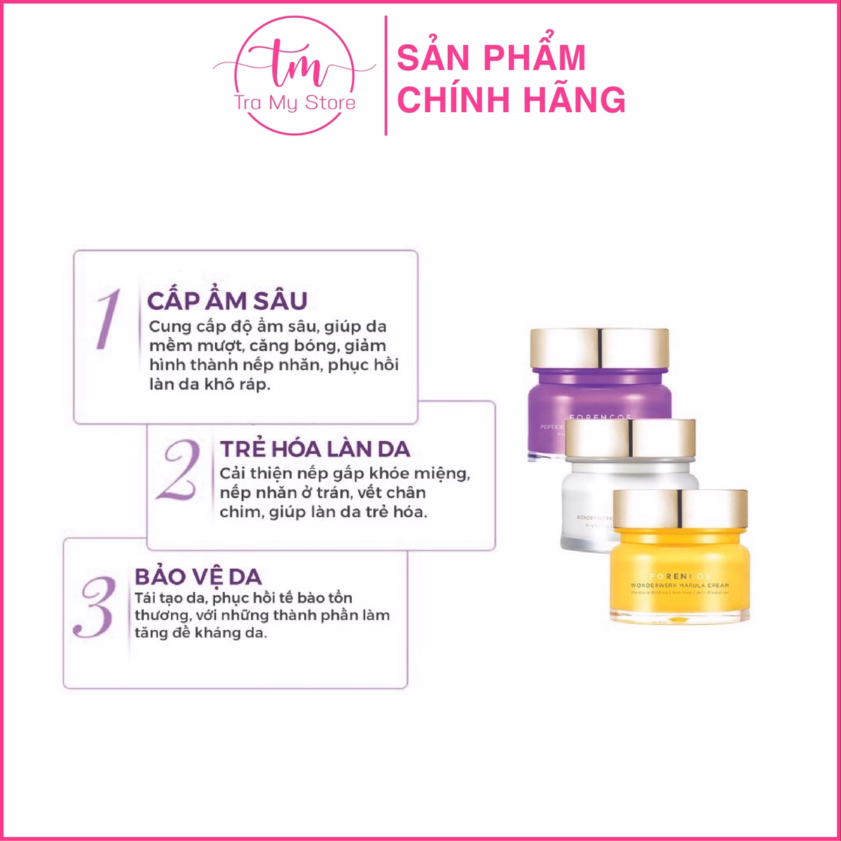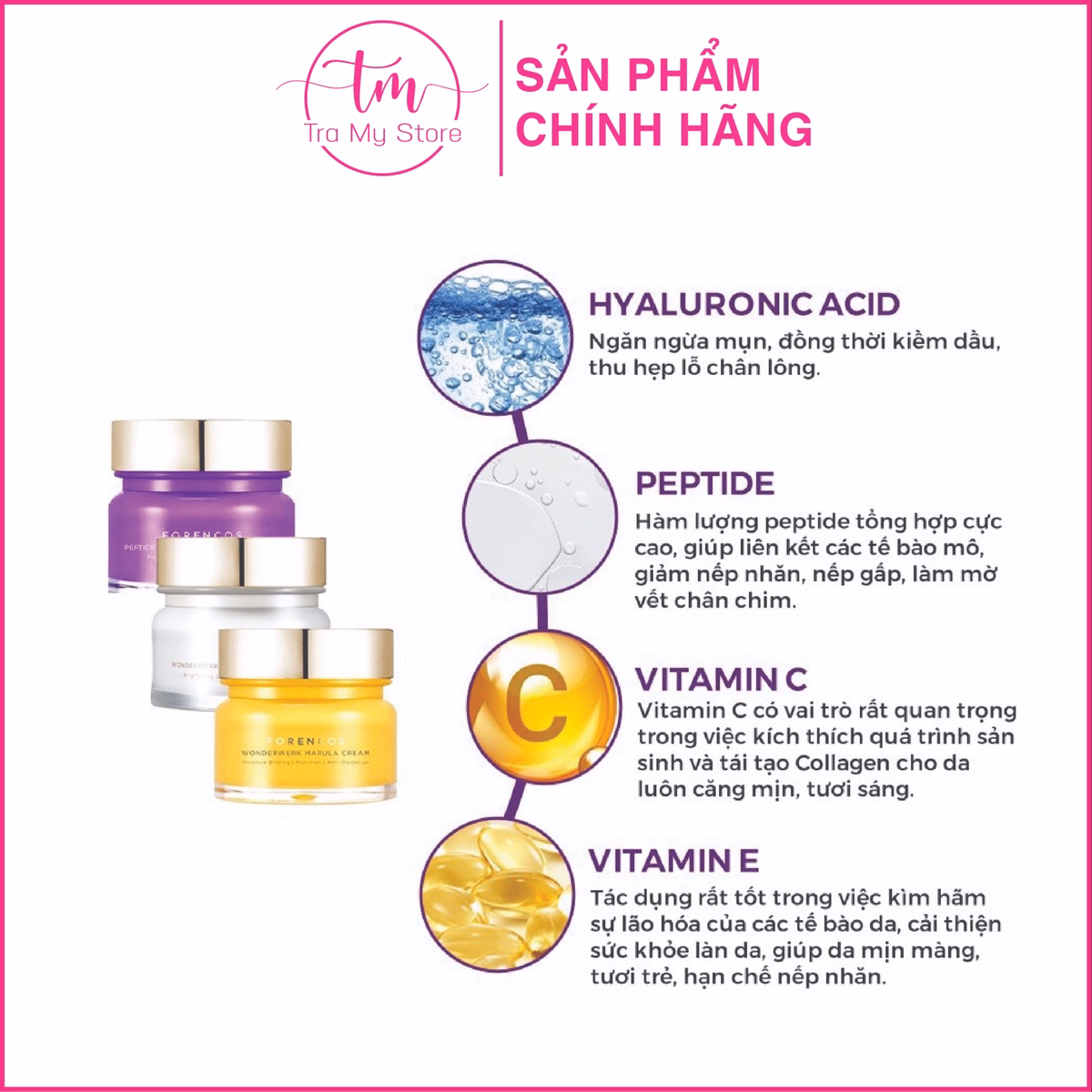 Kem dưỡng trắng da Forencos đến từ Hàn Quốc là sản phẩm kem dưỡng da đang làm mưa làm gió trên thị trường. Với nhiều công dụng nổi bật như làm trắng da, dưỡng ẩm, làm chậm quá trình lão hóa, giúp cho làn da luôn được căng mọng tươi trẻ và tràn đầy sức sống. Sản phẩm được chiết xuất từ những thành phần lành tính và an toàn cho làn da phải kể đến như Peptide 14% giúp liên kết các tế bào mô, giảm nếp nhăn, nếp gấp, làm mờ vết chân chim. Nghệ tây: Giúp làm sáng da, mờ vết thâm sạm nám, hỗ trợ thúc đẩy làm liền sẹo thâm, lồi lõm. Thông đỏ: Chứa hàm lượng vitamin E cực cao, giúp làm mềm mượt da, trị sẹo, dưỡng ẩm sâu, và bảo vệ da tốt trước Uv. Ngoài ra, chiết xuất cây phỉ, rau má, rau sam, dầu đậu nành… cũng bổ sung dưỡng chất, hỗ trợ làm đẹp da.