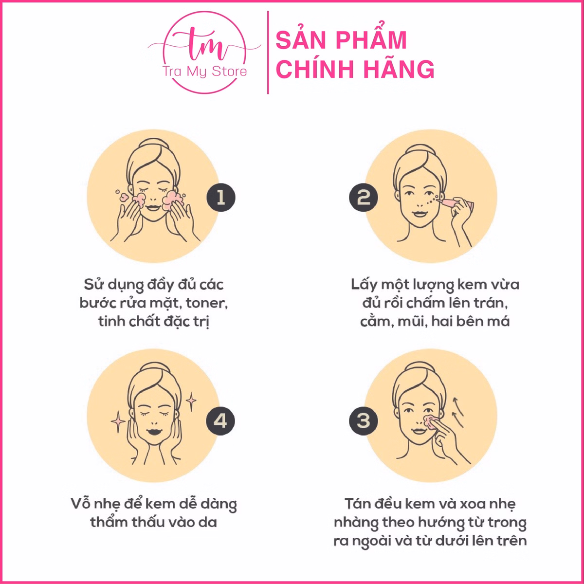 Sử dụng ở bước cuối cùng của chu trình chăm sóc da. Lấy một lượng kem vừa đủ thoa đều theo chiều kết cấu da, kết hợp massage nhẹ nhàng để sản phẩm được hấp thụ tối đa.