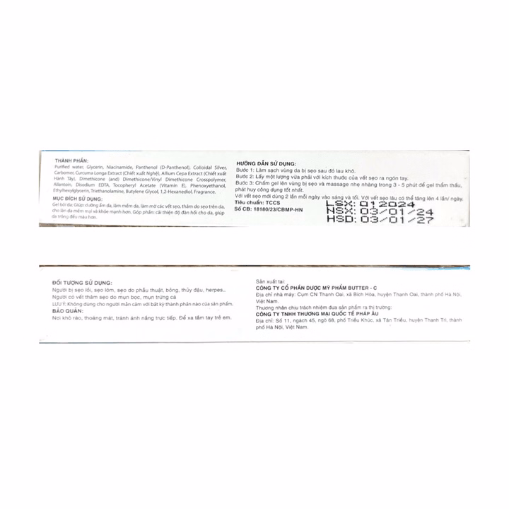 Purified water, Glycerin, Niacinamide, Panthenol (D-Panthenol), Colloidal Silver, Carbomer, Curcuma Longa Extract (Chiết xuất Nghệ), Allium Cepa Extract (Chiết xuất Hành Tây), Dimethicone (and) Dimethicone/Vinyl Dimethicone Crosspolymer, Allantoin, Disodium Edta, Tocopheryl Acetate (Vitamin E), Phenoxyethanol, Ethylhexylglycerin, Triethanolamine, Butylene Glycol, 1,2-Hexanediol, Fragrance.
