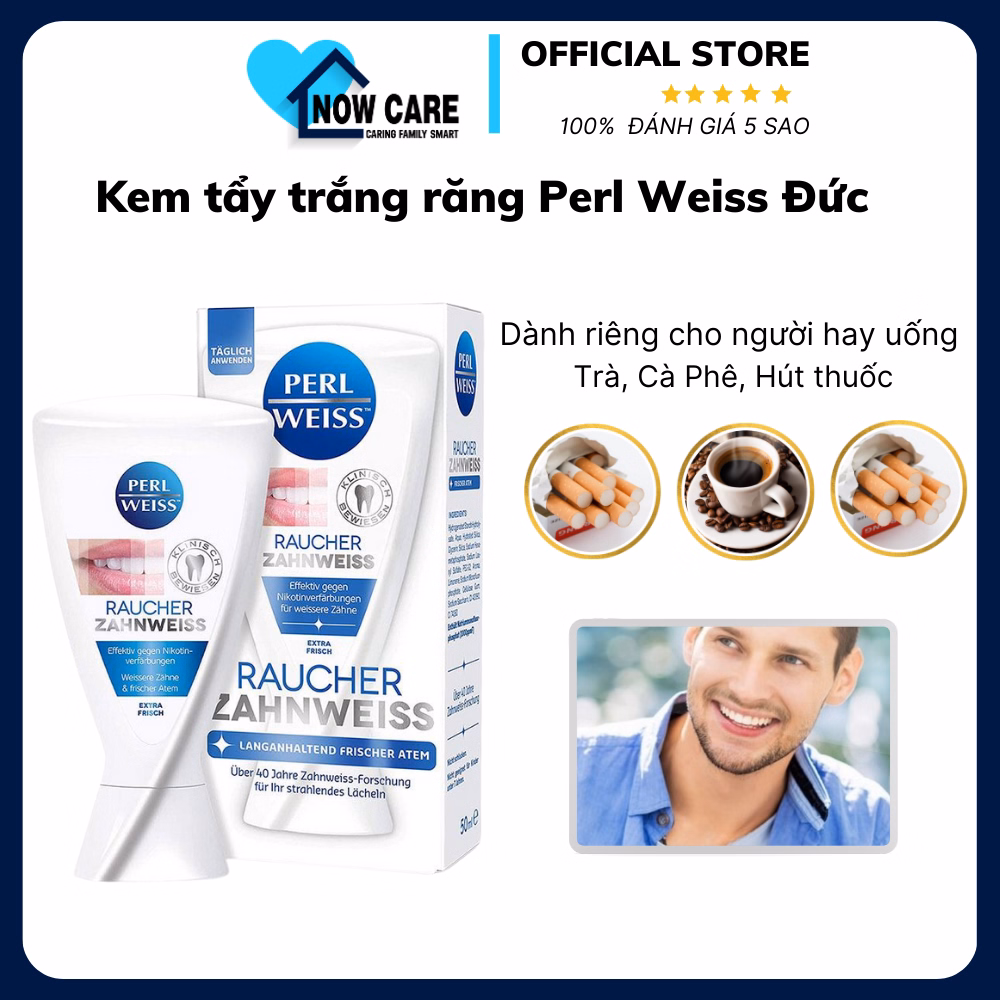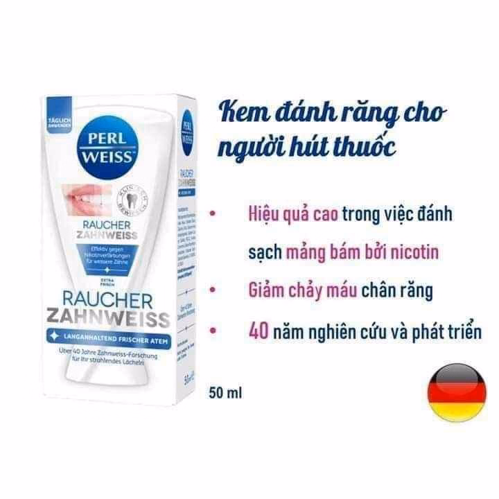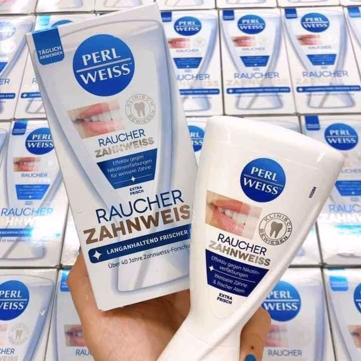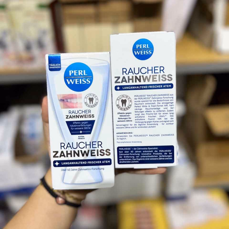 Kem đánh trắng răng Perl Weiss Raucher (màu xanh) dành cho người hút thuốc, uống trà, cà phê giúp loại bỏ các mảng bám, ố vàng trên răng. Công thức thức đặc biệt chống lại sự làm đổi màu răng do chất ni-cotine. Giúp răng trắng bóng và hơi thở thơm mát lâu dài.