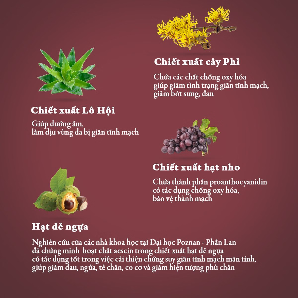 Chiết xuất cây phỉ: Chứa các chất chống oxy hóa và thành phần thiên nhiên giúp giảm tình trạng giãn tĩnh mạch, giảm bớt sưng đau do suy giãn tĩnh mạch.