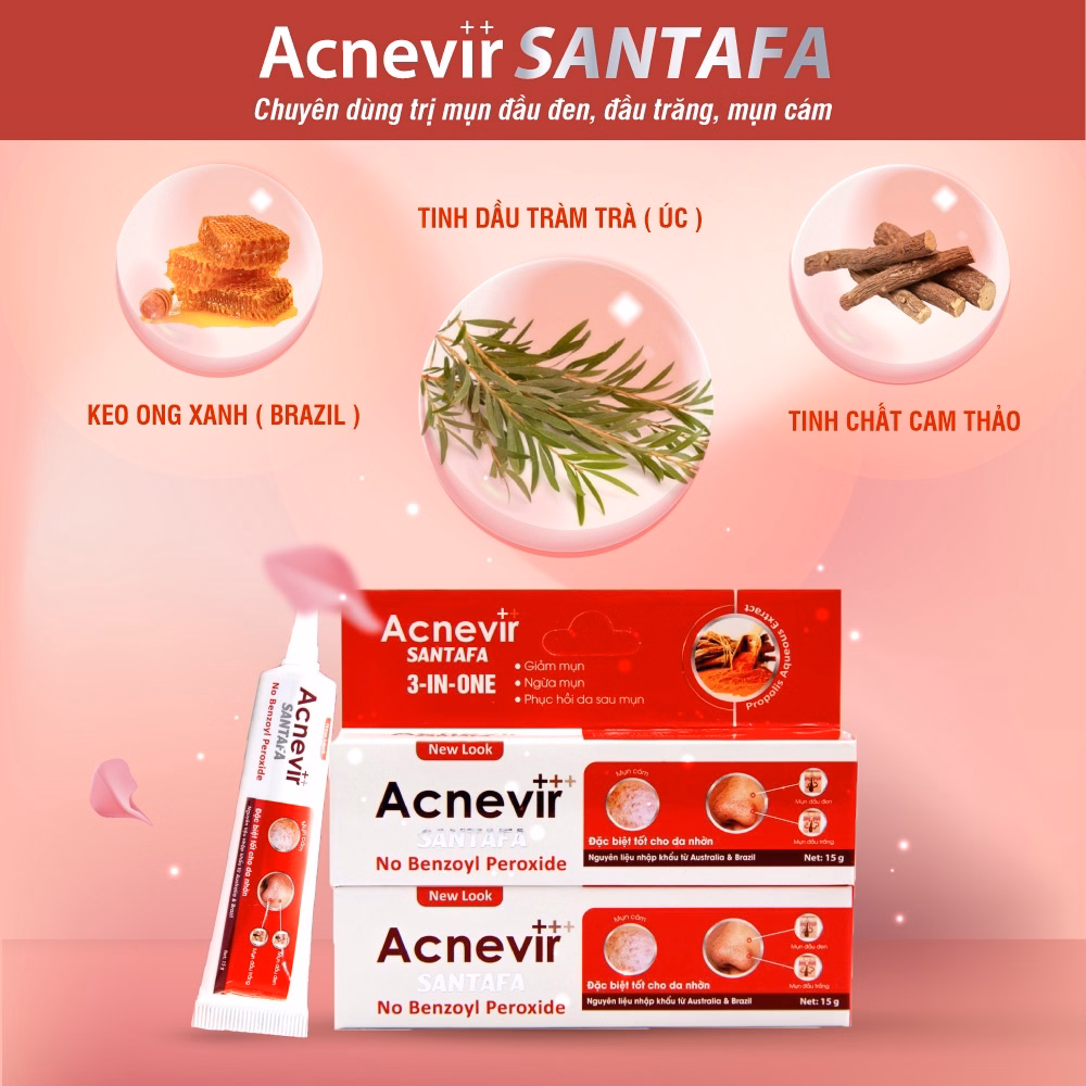 Gel Acnevir Santafa đỏ với bộ 3 kết hợp từ tinh dầu tràm trà, keo ong và hoạt chất Isopropyl Methyl Phenol, mang lại công dụng giúp làm giảm sự tiết bã nhờn, ngăn chặn sự phát triển của vi khuẩn gây mụn và ngăn ngừa bít tắc lỗ chân lông.