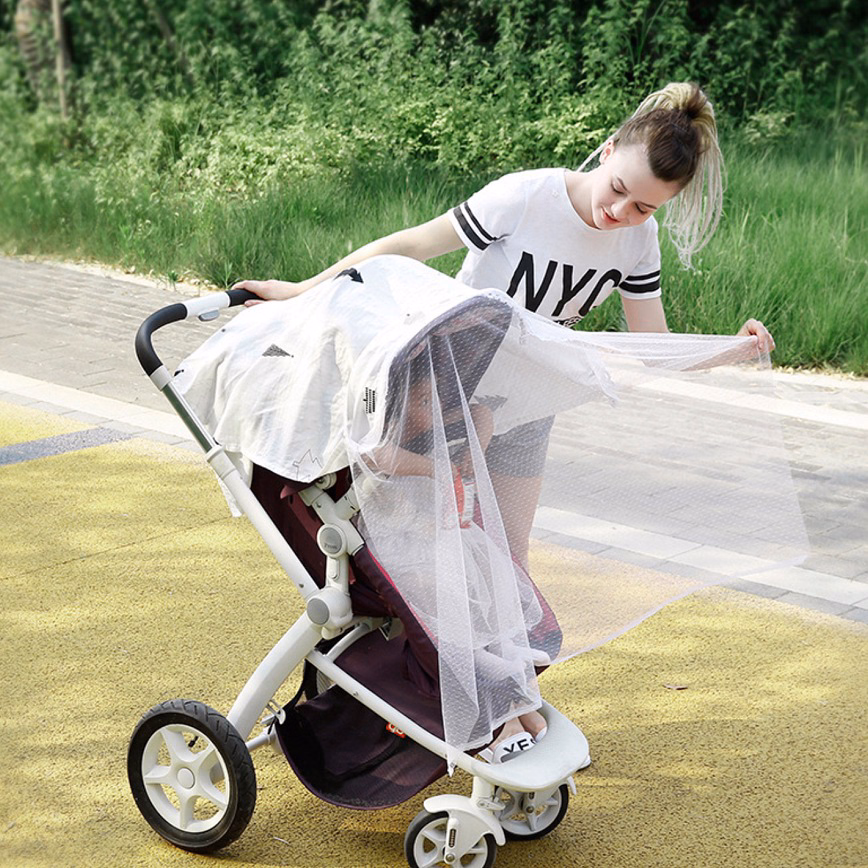 • Mẹ có thể dùng lớp voan che cửa xe đẩy che bụi và côn trùng cho bé