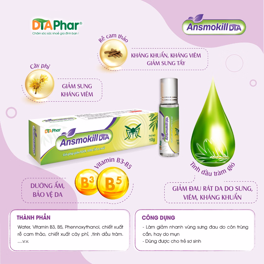 Lăn Muỗi Ansmokill Dta Giúp Giảm Ngứa Sưng Tấy Do Muỗi Đốt Dùng Được Cho Phụ Nữ Có Thai Và Trẻ Sơ Sinh Chai 10Gr
