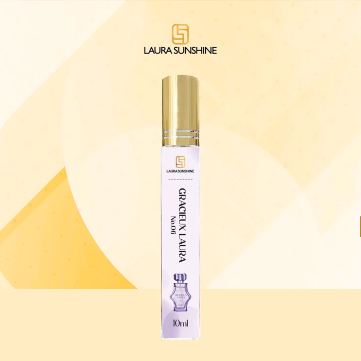Nước hoa nữ Laura Sunshine No.06 Gracieux Laura 10ml – Nữ tính, Tươi tắn, Gợi cảm – mùi hương tạo cảm giác thư giãn, mềm mại và vô cùng nữ tính, khiến nàng sẽ trở nên ngọt ngào, nhẹ nhàng như một viên kẹo ngọt, mộng mơ, hồn nhiên nhưng cũng nóng bỏng khiến người khác chỉ muốn ôm nàng vào lòng.