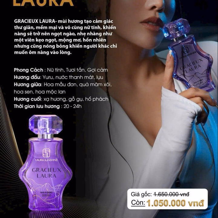 Nước hoa nữ Laura Sunshine No.06 Gracieux Laura 100ml – Nữ tính, Tươi tắn, Gợi cảm – mùi hương tạo cảm giác thư giãn, mềm mại và vô cùng nữ tính, khiến nàng sẽ trở nên ngọt ngào, nhẹ nhàng như một viên kẹo ngọt, mộng mơ, hồn nhiên nhưng cũng nóng bỏng khiến người khác chỉ muốn ôm nàng vào lòng.