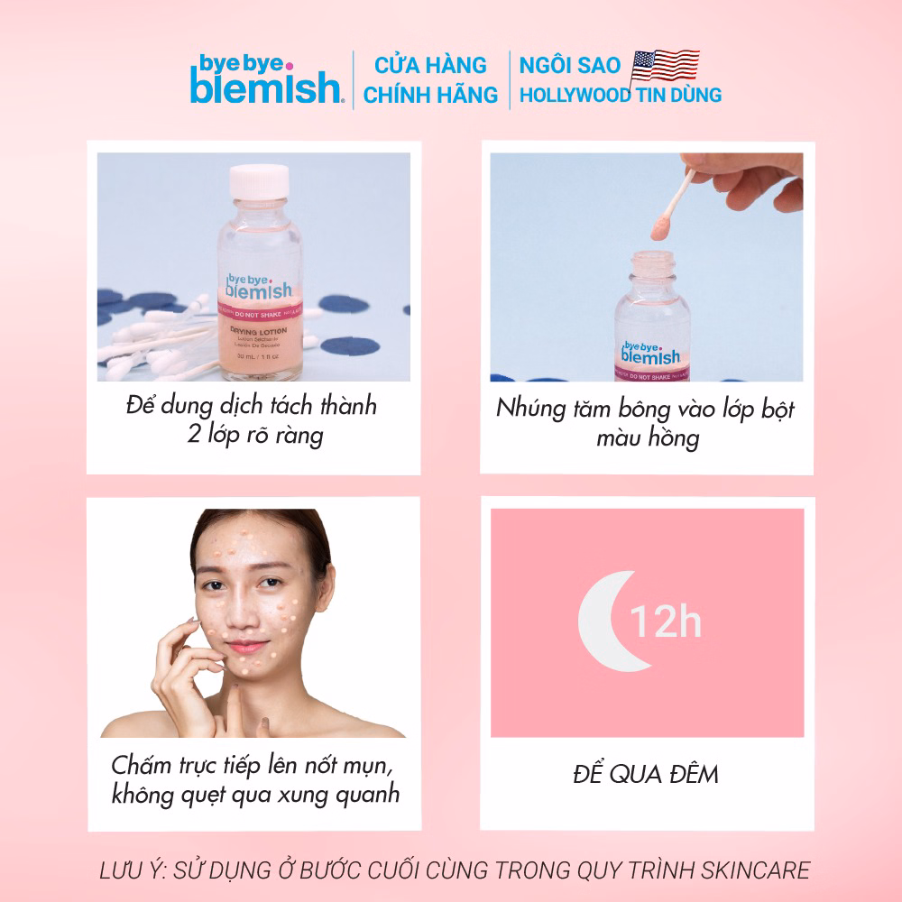 Bye Bye Blemish, với triết lí Giảm mụn nhanh – hiệu quả chỉ sau 1 đêm nhưng vẫn đảm bảo an toàn và hoàn toàn lành tính cho mọi làn da, kể cả làn da nhạy cảm nhất.