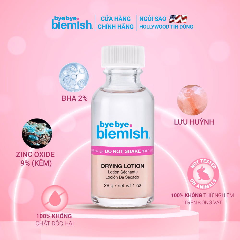 Công thức điều trị mụn của Bye Bye Blemish là từ Acid Salicylic (hay còn gọi là Bha) với nồng độ là 2%, kết hợp với Zinc Oxide 10% (Kẽm). Cho phép làm khô cồi mụn hoàn toàn tự nhiên, thấm sâu và lỗ chân lông để điều trị và làm dịu da.