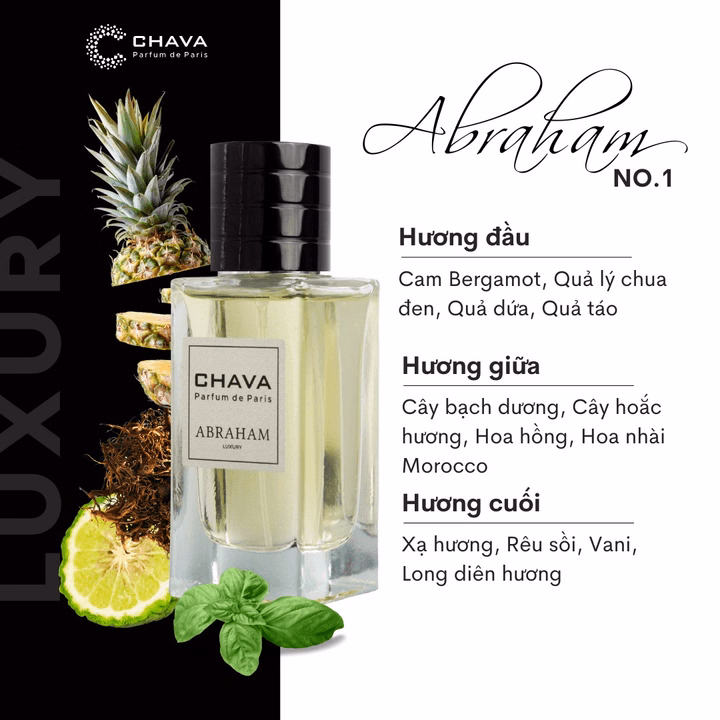 Mùi hương Chava Luxury Abraham xuất phát từ vẻ đẹp của quốc đảo Chypre (đảo Síp), một nơi có khí hậu ấm áp và là thiên đường sinh sôi và nảy nở của rất nhiều loài cây hoa quả tỏa hương, ngập tràn mùi hương tự nhiên.