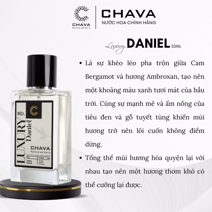 Chava Daniel là sự khéo léo pha trộn giữa Cam Bergamot và hương Ambroxan, tạo nên một khoảng màu xanh tươi mát của bầu trời. Cùng sự mạnh mẽ và ấm nồng của tiêu đen và gỗ tuyết tùng khiến mùi hương trở nên lôi cuốn không điểm dừng. Tổng thể mùi hương hòa quyện lại với nhau tạo nên một hương thơm khó có thể cưỡng lại được.