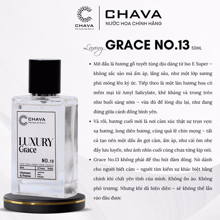 Có những người không cần nói nhiều, nhưng chỉ cần họ bước qua – không gian như đổi khác. Mùi hương họ mang theo không rõ ràng, không nồng nàn, nhưng lại khiến người ta cứ mãi vấn vương. Grace No.13 chính là như thế – nhẹ nhàng, trong trẻo, gợi cảm một cách tinh tế và sang trọng.