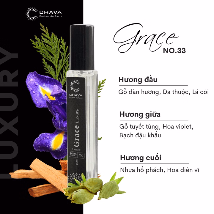 Được điều chế từ 33 nguyên liệu khác nhau, trong đó chủ yếu là gỗ đàn hương Úc, gỗ tuyết tùng, bạch đậu khấu,… Do đó Chava Luxury Grace N033 không có mùi hương ngọt ngào, thay vào đó nó lôi cuốn và mạnh mẽ, mang đến nét cá tính rất riêng cho người sử dụng. Đây là chai nước hoa được cả 2 giới yêu mến sử dụng.
