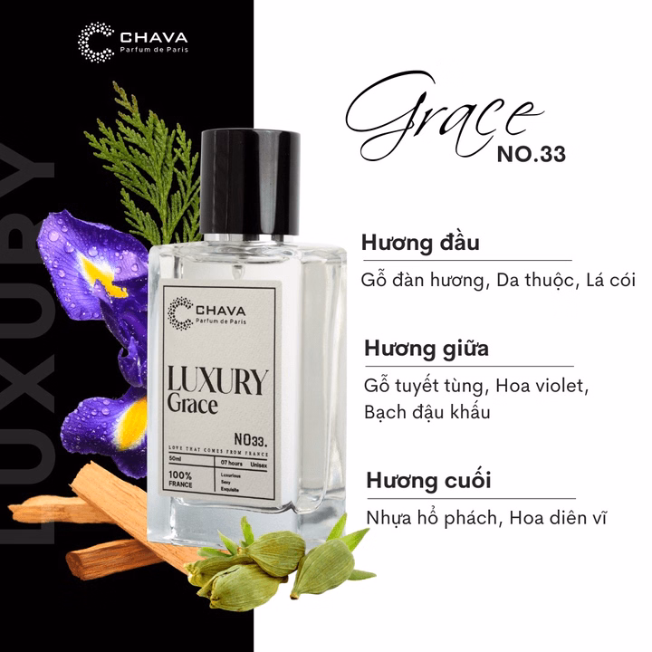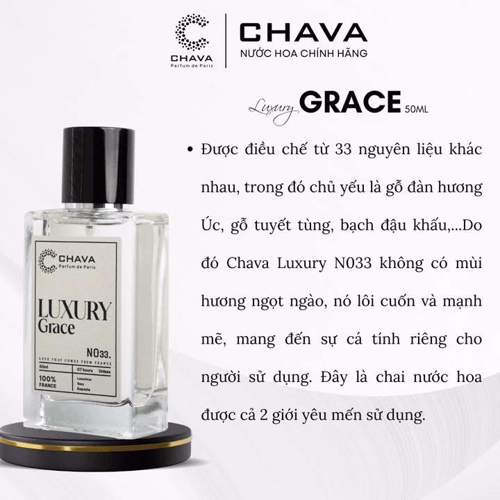 Được điều chế từ 33 nguyên liệu khác nhau, trong đó chủ yếu là gỗ đàn hương Úc, gỗ tuyết tùng, bạch đậu khấu,… Do đó Chava Luxury Grace N033 không có mùi hương ngọt ngào, thay vào đó nó lôi cuốn và mạnh mẽ, mang đến nét cá tính rất riêng cho người sử dụng. Đây là chai nước hoa được cả 2 giới yêu mến sử dụng.