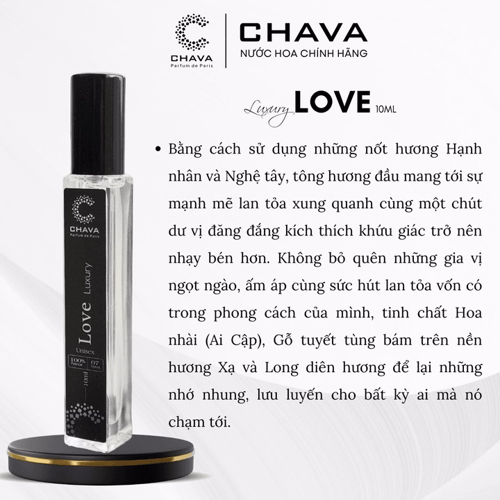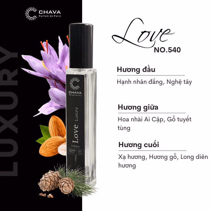 Chava Luxury Love N0540 cho ra những hương thơm sang trọng cùng nét trẻ trung đầy màu sắc của thời hiện đại. Bằng cách sử dụng những nốt hương Hạnh nhân và Nghệ tây, tông hương đầu mang tới sự mạnh mẽ lan tỏa xung quanh cùng một chút dư vị đăng đắng kích thích khứu giác trở nên nhạy bén hơn.