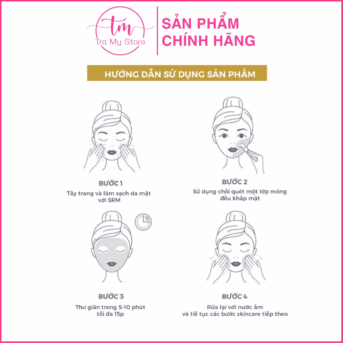 Đắp mặt nạ lên da, sau 15′ đến 20′ thì tháo gỡ mặt nạ, massage nhẹ nhàng dưỡng chất còn sót lại trên da để chúng thẩm thấu sâu hơn vào da. Có thể tận dụng dưỡng chất còn lại trong túi để massage cho phần da cổ.