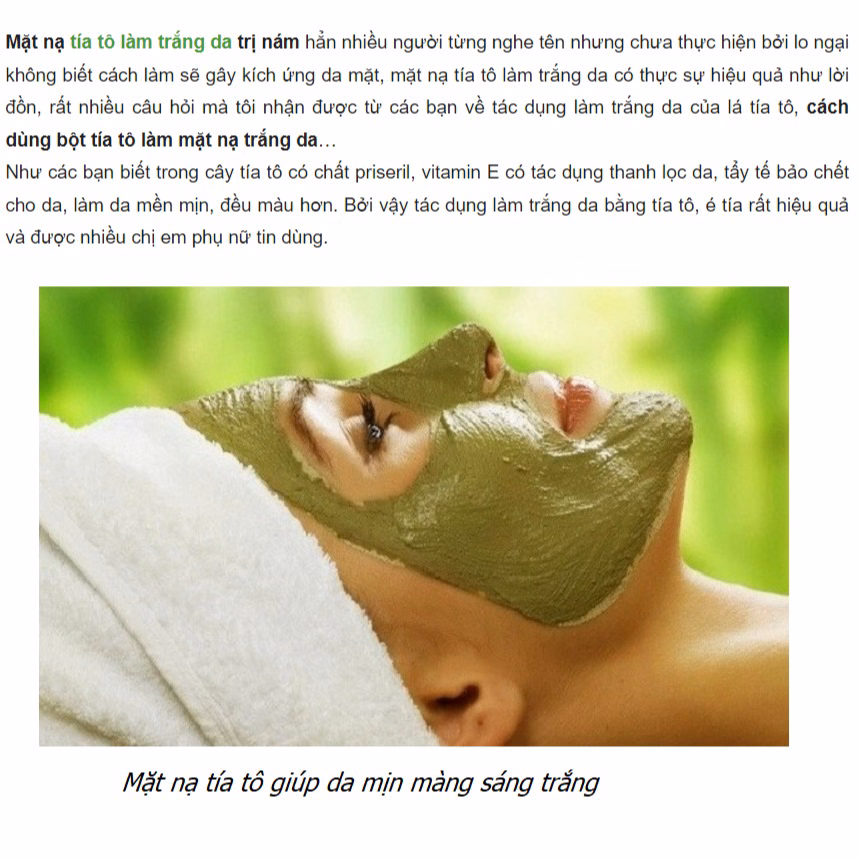 Hơn thế nữa, các chất có trong lá và thân tía tô khi thấm được vào sâu trong lớp biểu bì giúp cơ chế hoạt động của da sản sinh nhiều hơn. Giúp làn da không chỉ trắng mịn mà còn ngăn ngừa lão hóa. Đồng thời các chất dinh dưỡng thiết yếu từ lá tía tô giúp giải phóng nước và mồ hôi ứ đọng trong lỗ chân lông, giải quyết vấn đề mụn thịt quanh mắt vô cùng hiệu quả.