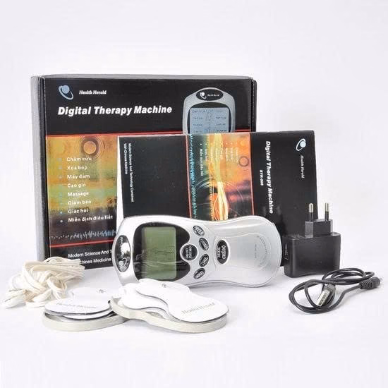 – 1 máy , 4 miếng dán gel điện cực , 1 dây nối điện cực , 1 sách Hd , 3 cục pin size Aaa , 1 củ sạc + 1 dây nối sạc