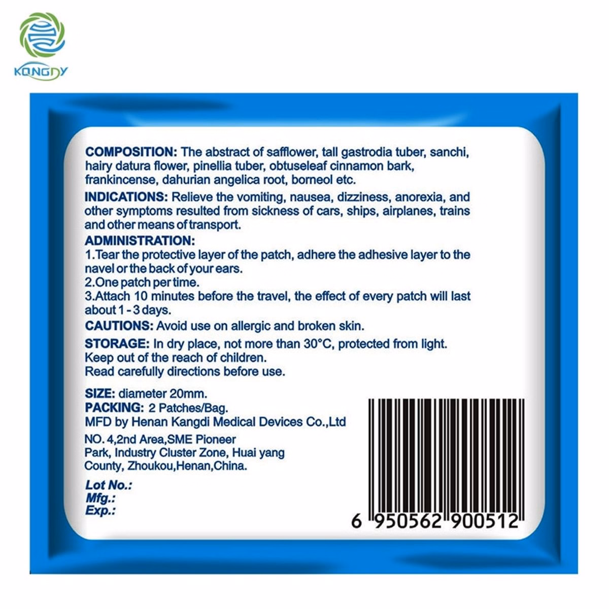 Miếng dán chống say tàu xe – Motion Sickness Patch – Kong Di với thành phần chiết xuất của các loại dược liệu: Hồng hoa, Thiên ma, Tam thất, Hoa cà, Bán hạ, Quế, Nhũ hương, Bạch chỉ, Borneol giúp làm giảm nhanh các triệu chứng say tàu xe như nhức đầu, buồn nôn, khó chịu, say sẩm,… hiệu quả và tác dụng chỉ sau 10 phút sử dụng.