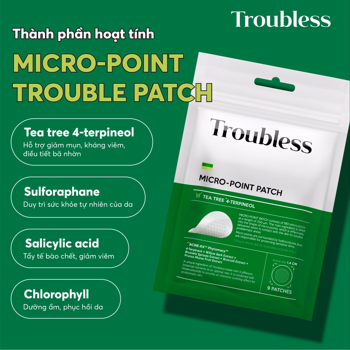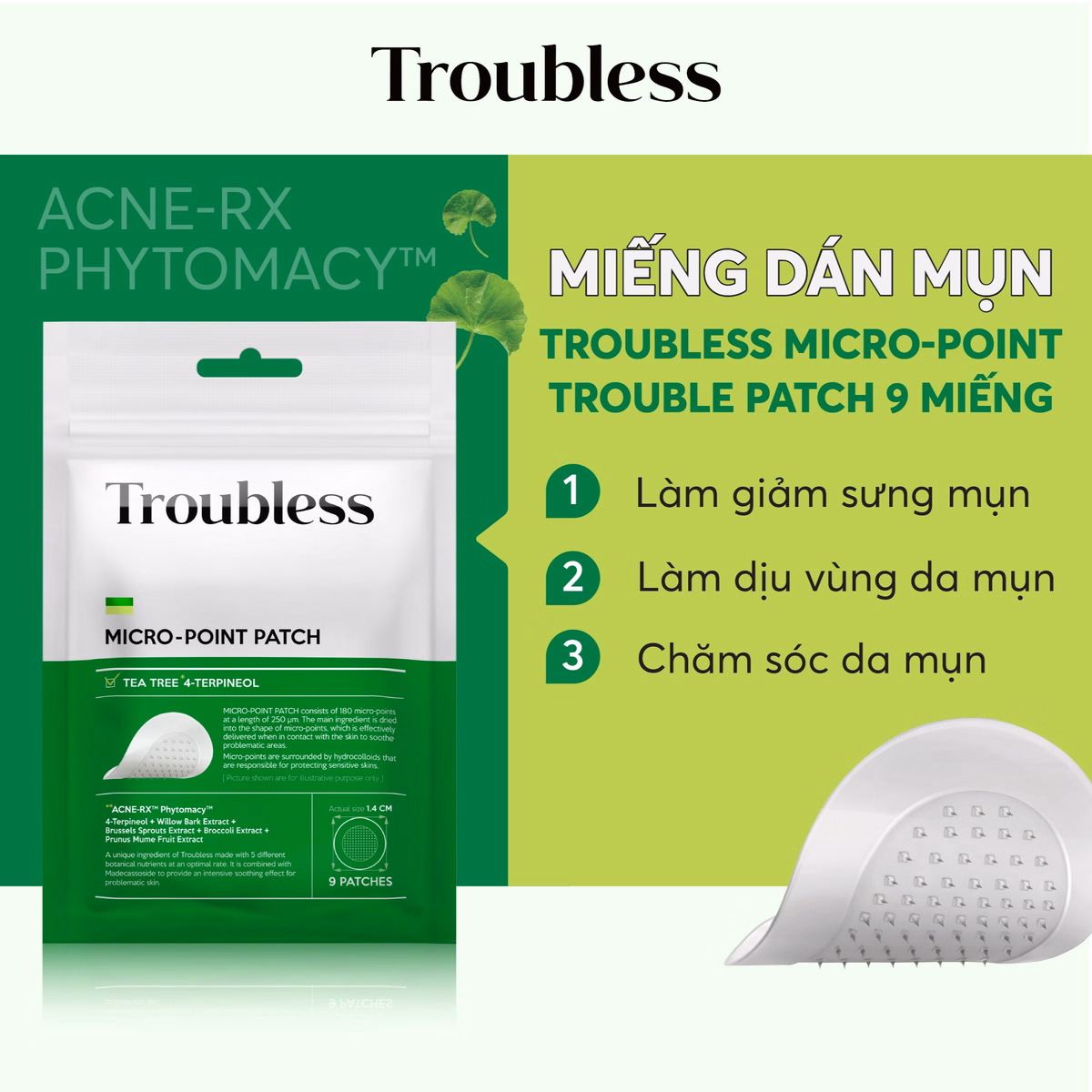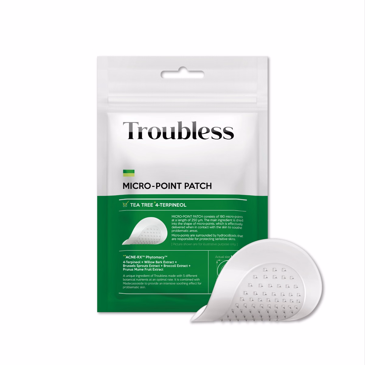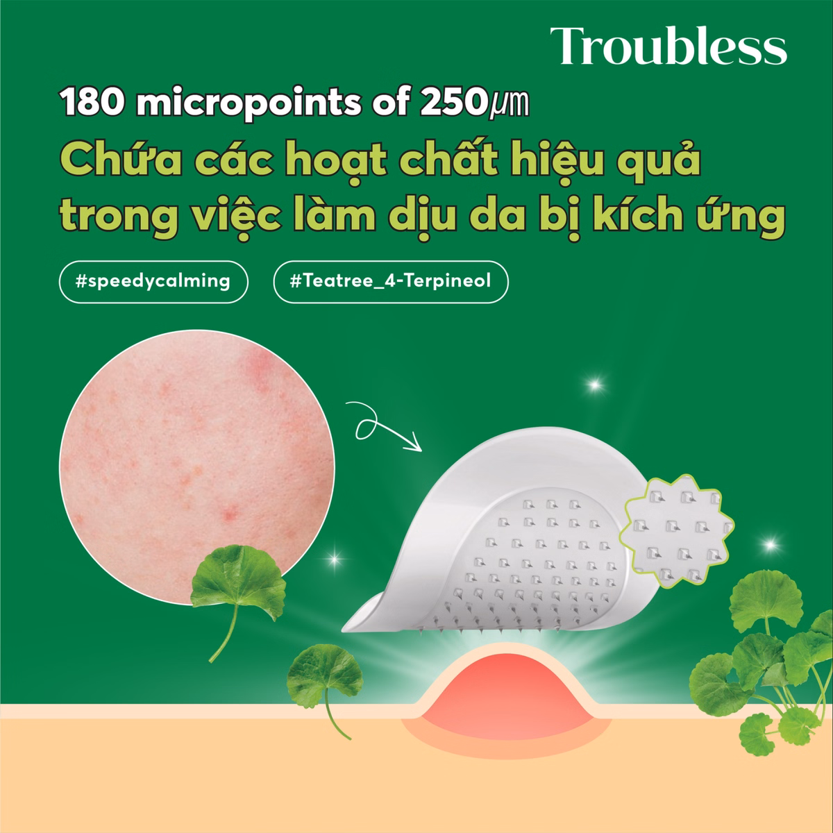 Miếng dán mụn Troubless Micro-Point Patch được thiết kế bằng băng Hydrocolloid, bổ sung các đầu nhọn siêu nhỏ chứa chiết xuất thực vật giúp: