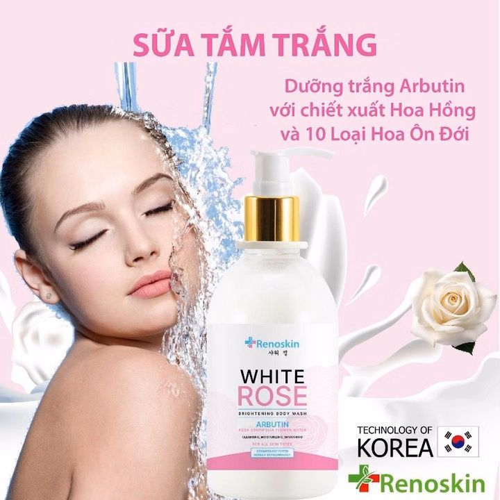 Sữa tắm trắng Hoa Hồng White Rose Renoskin với hoạt chất Arbutin giúp trắng sáng da, cùng với chiết xuất Hoa Hồng và 10 loại hoa Hàn Quốc giúp làn da trắng sáng, mịn màng, dưỡng ẩm cũng như quyến rũ với hương Hoa Hồng: