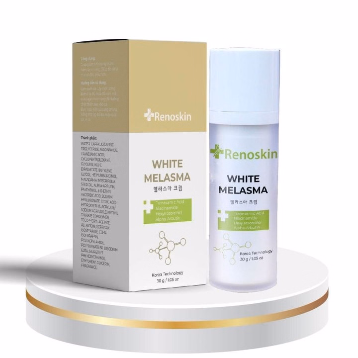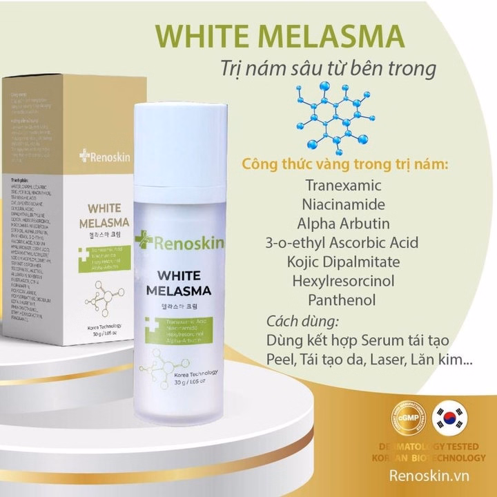 Kem trị Nám White Melasma Renoskin là kem trị nám Hàn Quốc mới nhất, với thành phần đầy đủ 7 hoạt chất vàng trong điều trị nám. Tranexamic, Niacinamide, Alpha Arbutin, 3-o-ethyl Ascorbic Acid, Kojic Dipalmitate, Hexylresorcinol, Panthenol…