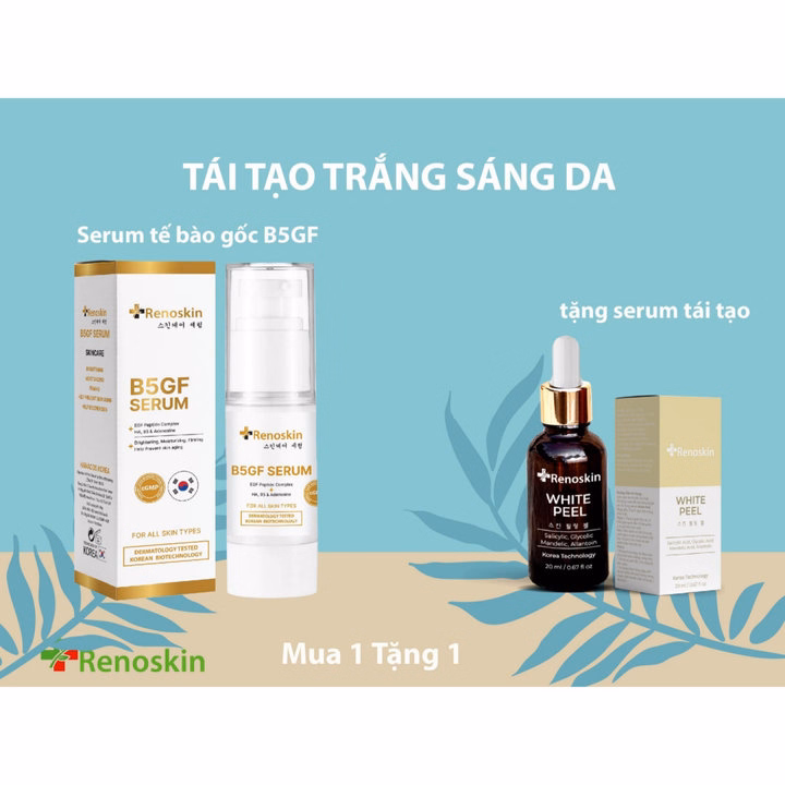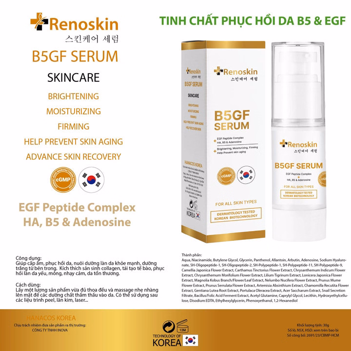 Renoskin B5gf chứa các yếu tố tăng trưởng, tế bào gốc Stemcell: Egf, Fgf, Igf, Vegf Peptide các vitamin và dưỡng chất nuôi dưỡng và ức chế thâm và sạm da như Vitamin B5, Niacinamide, Arbutin, Allantoin, Adenosine, Ha… Không những giúp tái tạo, phục hồi da mà còn hạn chế tình trạng, thâm nám, tàn nhang…