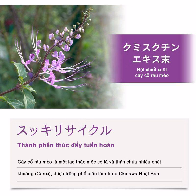 Thành phần: Dầu hoa nghệ tây (sản xuất tại Nhật Bản), bột nước ép quả xương rồng lê gai, chất sơ cây keo, bột chiết xuất cỏ râu mèo, bột chiết xuất cỏ ba lá ngọt melilot, bột chiết xuất cây tiêu lốt/gelatin, glycerin, sáp ong, axit béo glixerin, Vitamin E, β-carotene, lecithin thực vật (Chiết xuất từ đậu nành).