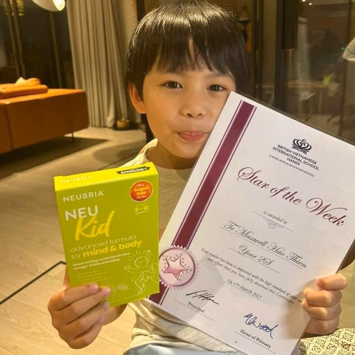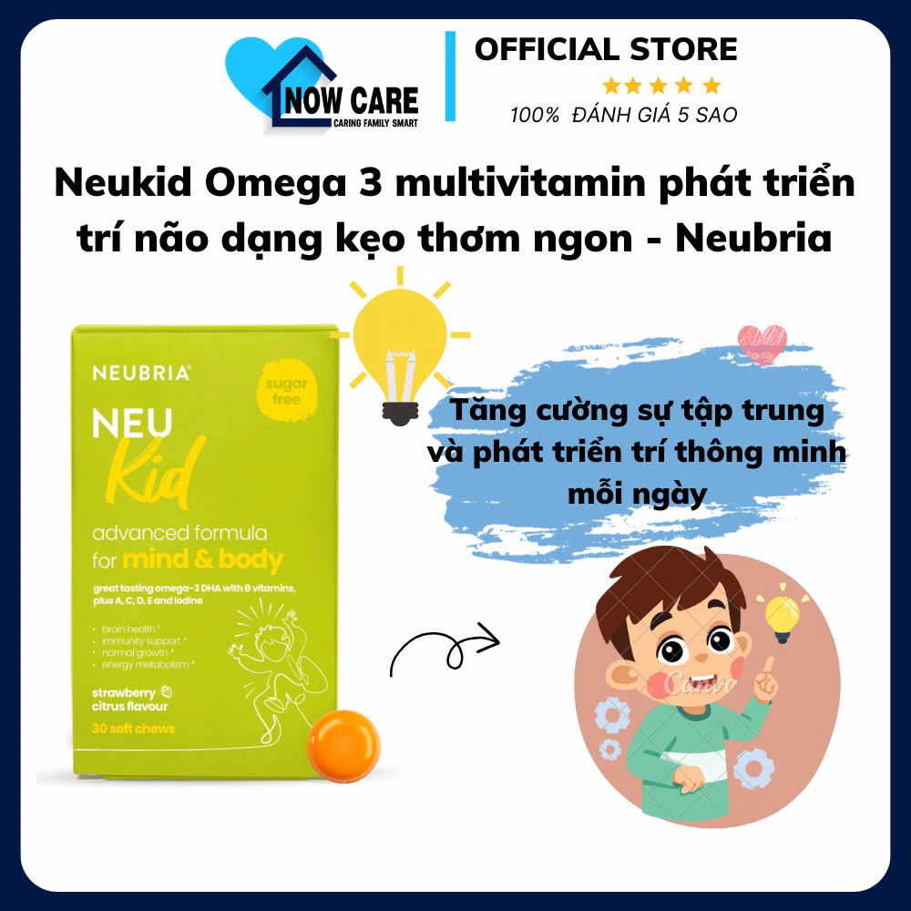 – Nếu mẹ đang tìm cách giúp bé hào hứng với các sản phẩm bổ sung omega 3 và vitamin giúp tăng cường trí não và thể trạng thì Neubria Newkid là một lựa chọn xuất sắc. Viên kẹo nhỏ bổ sung tới 300mg Omega 3 (bao gồm đầy đủ Dha và Epa) cộng với hơn 10 vi chất dinh dưỡng mà vẫn vô cùng thơm ngon thì rất hiếm hãng Dược làm được.