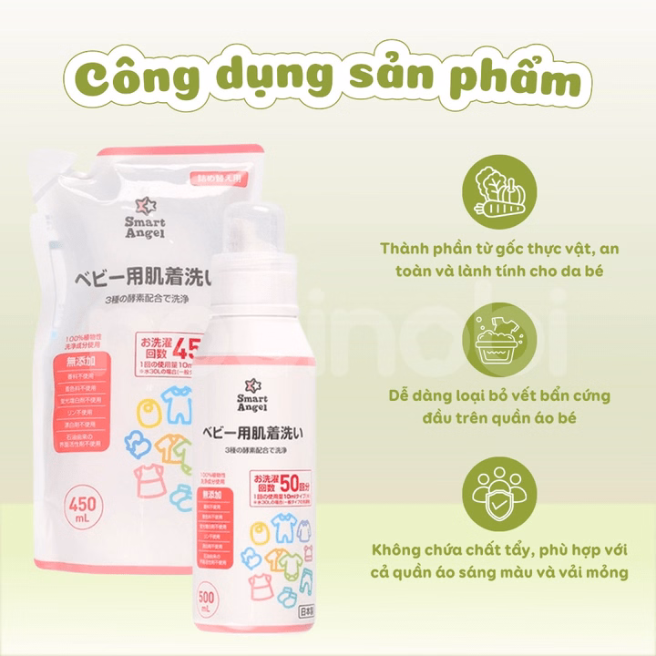 Nước giặt quần áo trẻ sơ sinh Smartangel là lựa chọn lý tưởng cho mẹ trong việc chăm sóc quần áo cho bé. Với công thức làm sạch từ gốc thực vật và hoàn toàn an toàn cho làn da nhạy cảm của trẻ, sản phẩm giúp loại bỏ hiệu quả các vết bẩn cứng đầu mà vẫn dịu nhẹ với da bé.