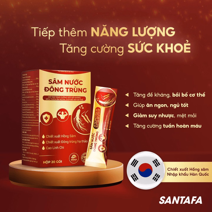 Nước Đông Trùng Hạ Thảo Giúp Bồi Bổ Cơ Thể Tăng Sức Khỏe Hỗ Trợ Ăn Ngủ Ngon Giảm Mệt Mỏi – Hộp 20 Gói – Santafa