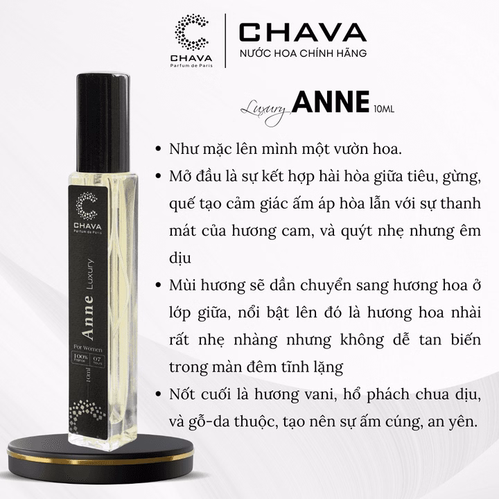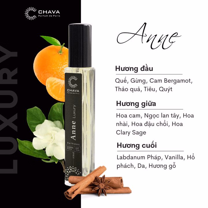 Chava Luxury Anne là mang sắc hương nở rộ của một khu vườn hoa, chính xác thì sản phẩm thuộc nhóm hương hoa phổ biến, thêm phần ấm áp nhờ vào các hương phụ là gia vị cùng gỗ.