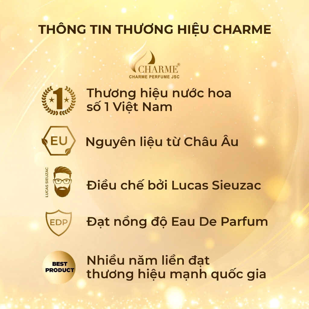 – Charme Perfume là một trong những thương hiệu nước hoa Pháp đáng tin cậy, nổi tiếng trên thế giới được nhiều người dùng ưa chuộng, đón nhận và đánh giá là sản phẩm chất lượng tốt, phù hợp với tiêu chí của người tiêu dùng.