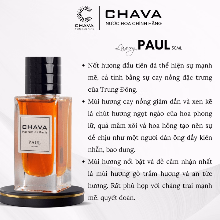 Chava Luxury Paul là tinh thần phóng khoáng và hào sảng của một chàng trai Paris, Paul tinh chế hương thơm pha trộn một chút ngông nghênh, phong lữ nhưng không kém phần cuồng nhiệt, mê hoặc.