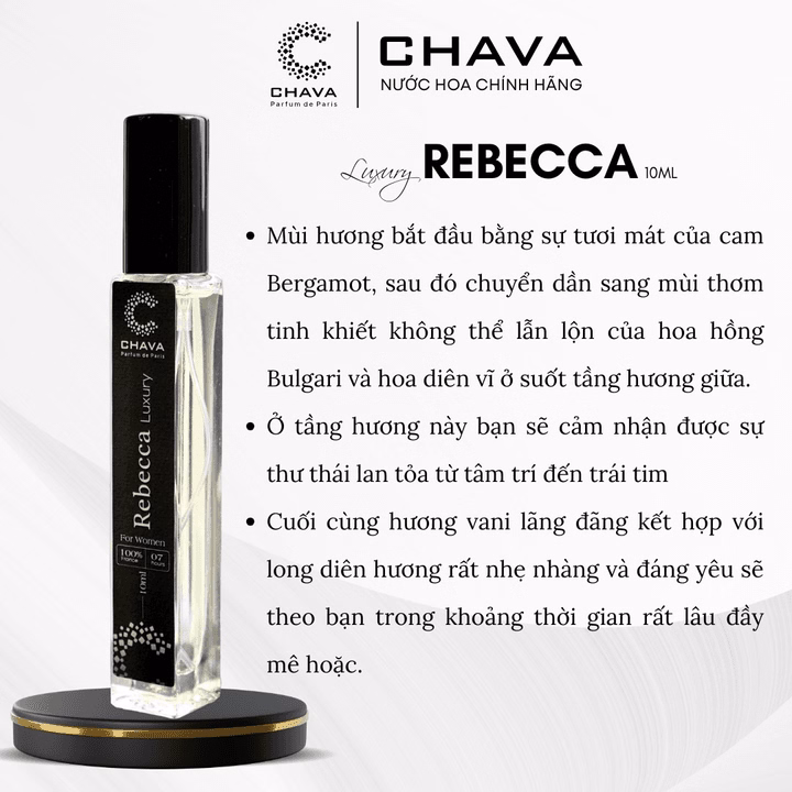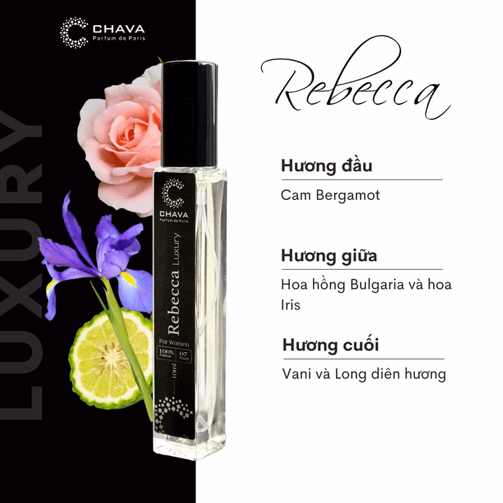 Chava Luxury Rebecca có mùi hương hài hòa, thanh lịch và không kém phần sang trọng. Mùi hương dòng nước hoa này làm cho người ta mường tượng về những cánh đồng tươi mát chớm nở trong ánh bình minh.