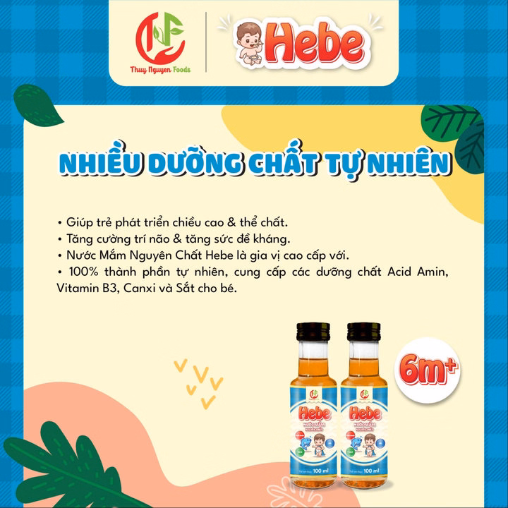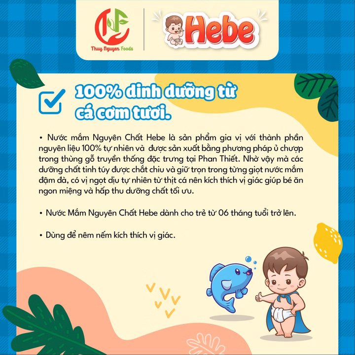 Nước mắm Nguyên Chất Hebe là sản phẩm gia vị với thành phần nguyên liệu 100% tự nhiên và được sản xuất bằng phương pháp ủ chượp trong thùng gỗ truyền thống đặc trưng tại Phan Thiết. Nhờ vậy mà các dưỡng chất tinh túy được chắt chiu và giữ trọn trong từng giọt nước mắm đậm đà, có vị ngọt dịu tự nhiên từ thịt cá nên kích thích vị giác giúp bé ăn ngon miệng và hấp thu dưỡng chất tối ưu. Nước Mắm Nguyên Chất Hebe dành cho trẻ từ 06 tháng tuổi trở lên. Dùng để nêm nếm kích thích vị giác.