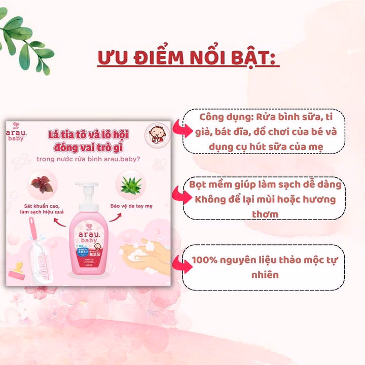 – Nước rửa bình sữa Arau Baby chứa các thành phần chiết xuất tự nhiên, không chứa phụ gia tổng hợp, đạt hiệu quả làm sạch cao và nhanh chóng, giúp mẹ dễ dàng làm sạch mọi thứ.