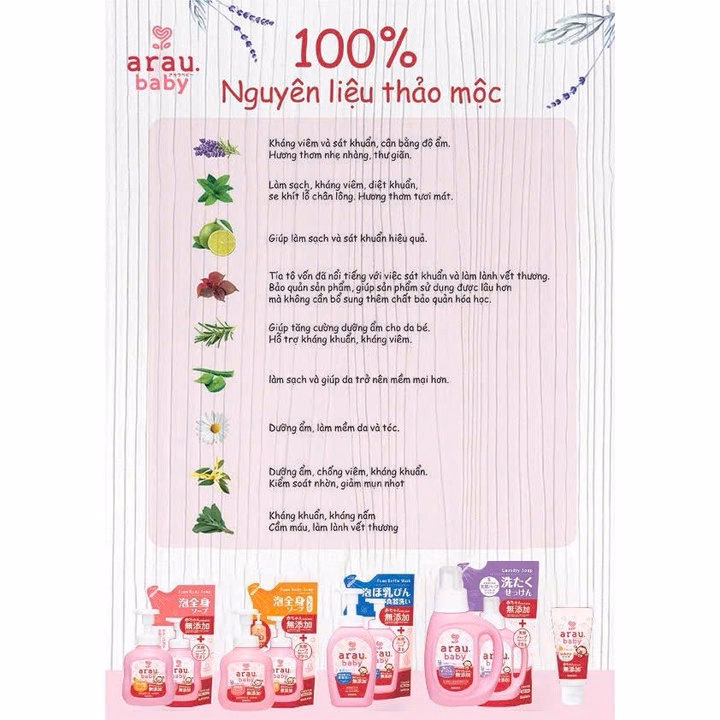 – Nước vệ sinh bình sữa Arau Baby không chứa chất tạo mùi tổng hợp. Thành phần gồm các chiết xuất thảo mộc với hương thơm tự nhiên của cây cỏ vừa làm mất mùi các vết bẩn được rửa, vừa làm át mùi của chất béo tự nhiên thường có trong thành phần của xà phòng, an toàn tuyệt đối khi sử dụng các dụng cụ đã được làm sạch từ nước rửa bình Arau Baby.
