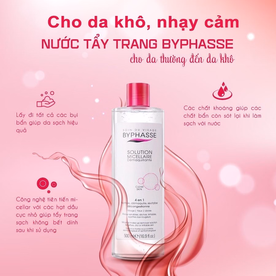 Nước tẩy trang Byphasse không cồn 3 in 1 của Tây Ban Nha được xem là bản dupe của tẩy trang Bioderma được sử dụng công nghệ Micellar facial cleanser, micellar cleansing water lấy đi tất cả bụi bẩn, cả lớp makeup cứng đầu giúp da sạch hiệu quả.